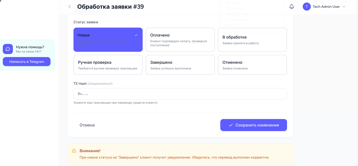 Раздел «Обработка заявки» — это центр управления жизненным циклом обменной операции. Скрипт обменника использует последовательную систему статусов, позволяющую безопасно проводить сделки от создания до завершения.